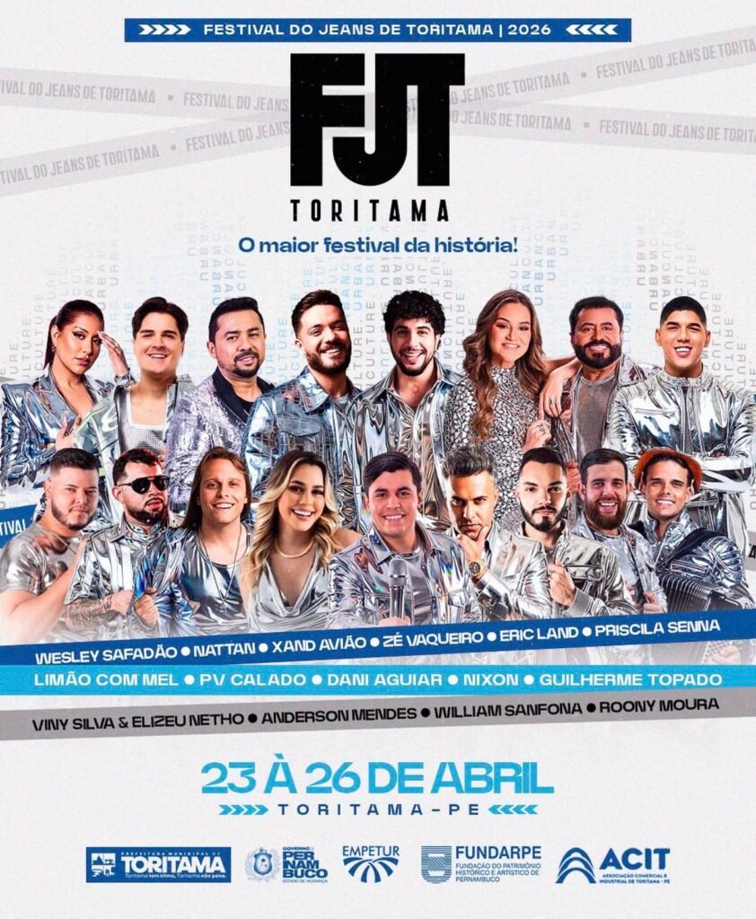 O prefeito de Toritama, Sérgio Colin (PP), anunciou oficialmente, na noite desta quinta-feira (26), a grade completa de atrações do Festival do Jeans (FJT) 2026. O lançamento reuniu influenciadores, organizadores e a imprensa, confirmando que o evento será realizado de 23 a 26 de abril.